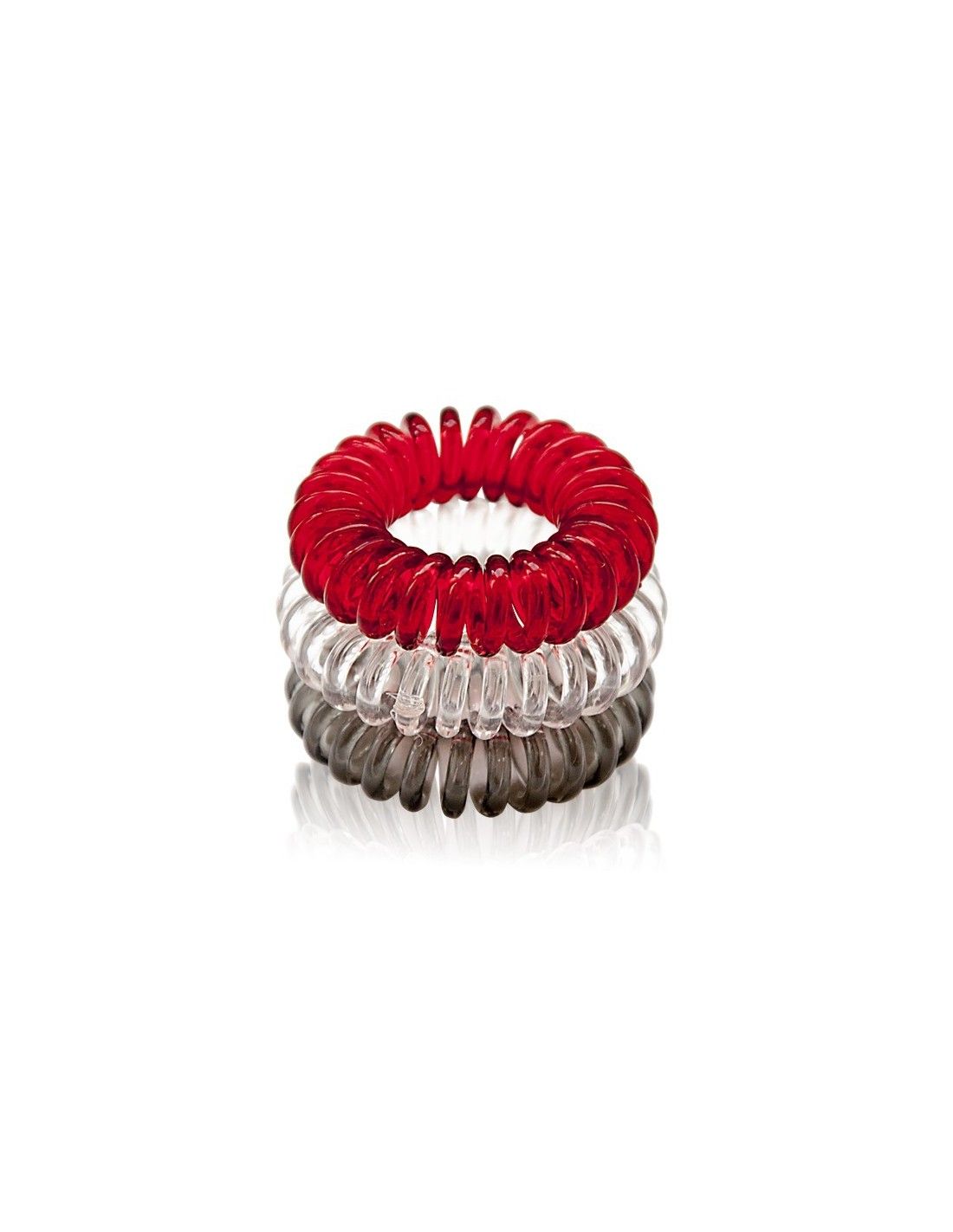 В отличие от обычных резиночек, на которых частенько остаются целые клочки волос, эта не наносит повреждений. Выполненная из мягкого силикона, она нежно относится к волосам, а спиралевидная структура позволяет избежать запутывания. Эта коллекция выполнена в классических цветах – красном, черном и прозрачном. Резинки из универсального набора можно сочетать с любыми образами в любых цветовых гаммах. Все они выполнены из полупрозрачного материала.